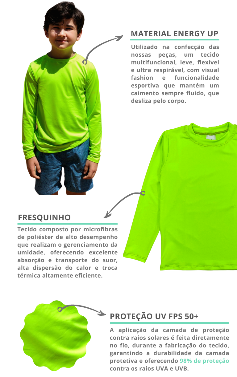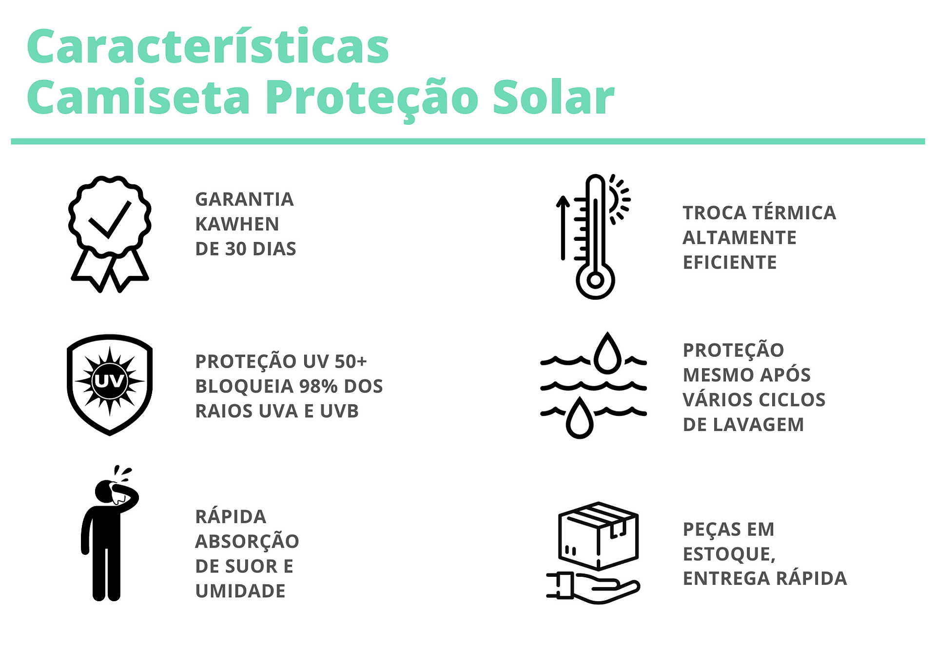 Camiseta com proteção solar permanente FPS 50+, bloqueia 98% dos raios UVA e UVB que podem ser nocivos a saúde. Camiseta em tecido Dry, composição 90% poliéster 10% elastano, mantém as características de nova mesmo após vários ciclos de lavagem, não desbota, não dá bolinha, seca rápido, não amassa e não precisa passar. Super confortável de usar, expele o suor rapidamente e permite liberdade dos movimentos :)